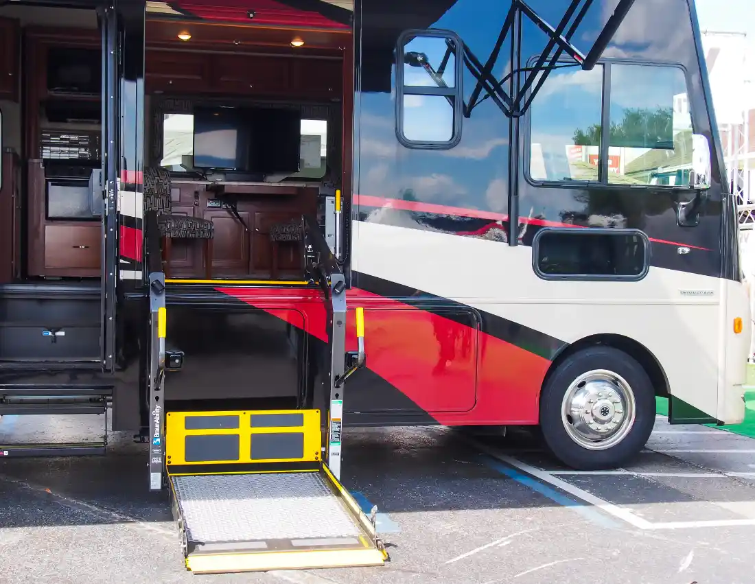 Handicapped wheelchair lift in a Class A RV Motorhome